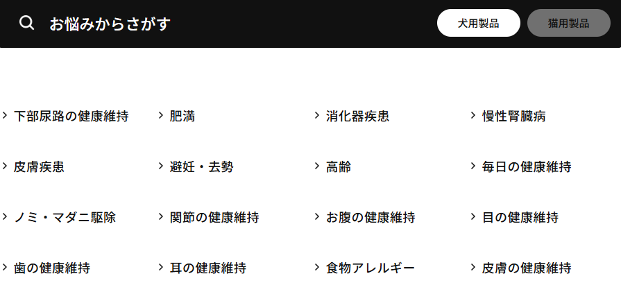 ベッツワンは、犬の体調管理、肥満・尿路・消化器・皮膚・高齢ケアなど、症状別に設計された食事療法食が揃っています。