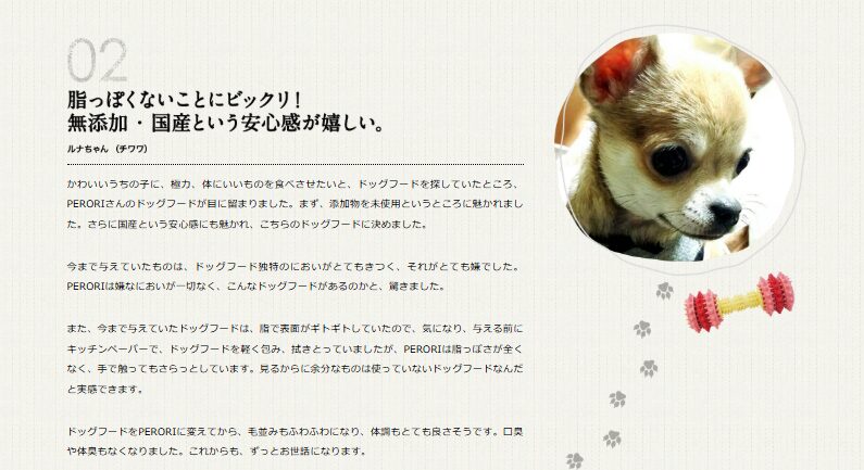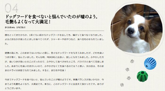 安心して食べさせられることと、これからもいつまでも元気でいてほしいので、これからもPERORIさんのフードを食べさせたいと思います。