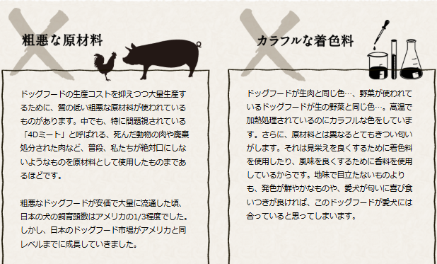 | 穀物や小麦を使っていないから、アレルギーに配慮できるよ! | 新鮮なお肉が主原料。お肉好きなわんちゃんの食いつきも抜群! | 人も食べられるレベルの安心食材でできているから信頼できる! |