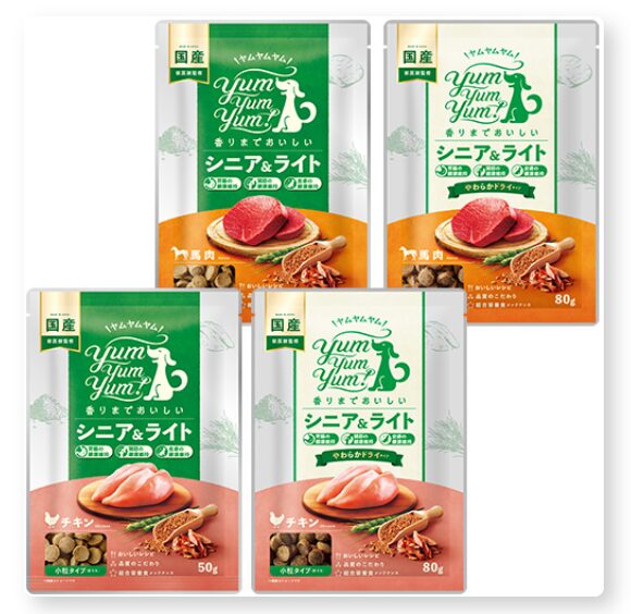 | シニア&ライト チキン やわらかドライ | YumYumYum! | 成犬〜シニア(体重管理) | 80g 80g×5 80g×10 | 鶏肉 | 日本 | しっとりセミモイスト/個包装80g | 約261kcal | 小粒(標準) |
