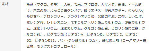 成分表を見る限り悪い添加物も入っていないし、栄養面でも安心できます。以前はコロコロした硬い便が出ていましたが、便の調子も改善されて、いまでは踏ん張ることなくすんなりと排便しています