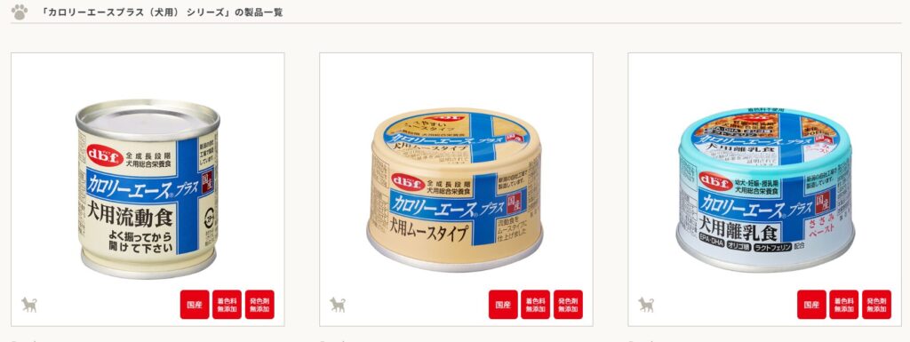 | カロリーエースプラス 犬用流動食 | デビフ | 全年齢 | 全犬種 | 約85g | 鶏肉 | 日本 | 流動食 | 約100kcal/本 | 不明 | 液状 |