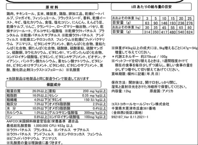 | カークランドシグネチャー 成犬用 | カークランド | 成犬 | 中型犬・大型犬 | 12kg | チキン、穀類 | アメリカ | ベーシック設計 | 約350kcal/100g | 標準 | ドライ |
