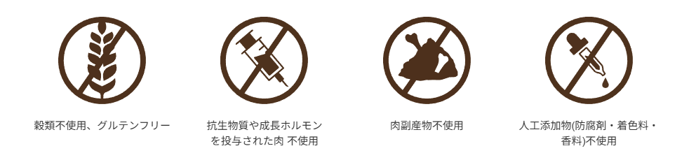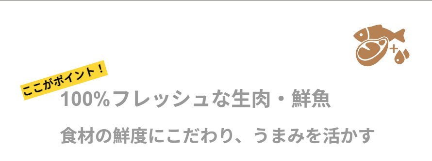 穀物や小麦を使っていないから、アレルギーに配慮できるよ! | 新鮮なお肉が主原料。お肉好きなわんちゃんの食いつきも抜群! | 人も食べられるレベルの安心食材でできているから信頼できる! |