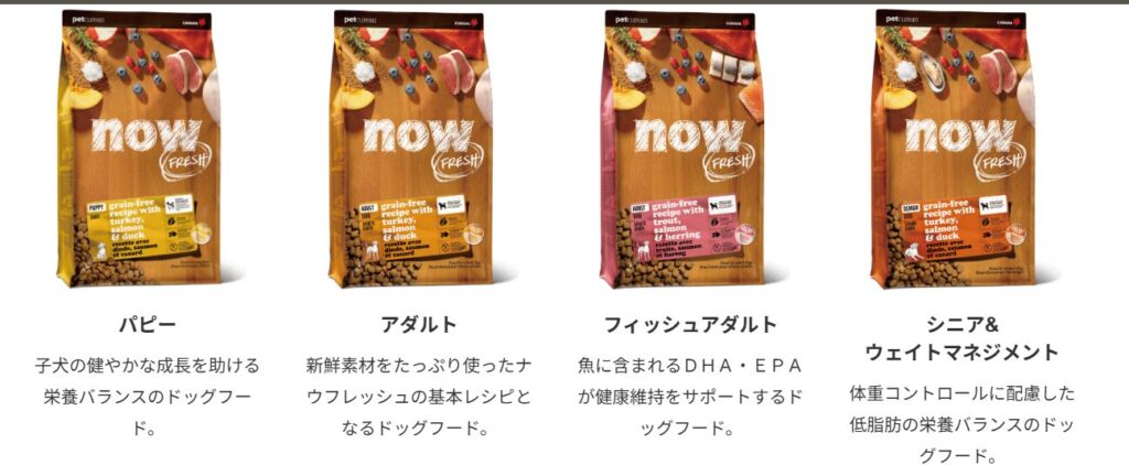 ナウフレッシュは全年齢対応のラインナップを持ち、子犬からシニア犬まで幅広く対応できます。