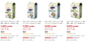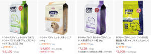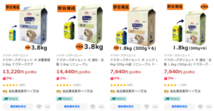 犬用のシニア・体重管理・パピー用など複数種類のドクターズダイエット商品が並び、3.8kgや1.8kgなどのサイズが購入可能です。