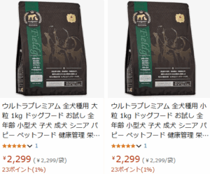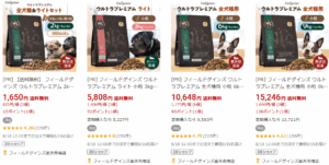 Amazonでも「フィールドゲインズ ウルトラプレミアム 全犬種用 小粒 1kg」など実際に販売されているので、在庫さえあればすぐに入手できます。