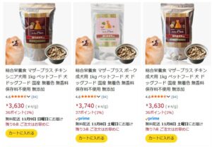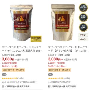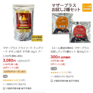 Amazonでは「マザープラス ドッグフード チキン 成犬用 1kg」などの出品があります。