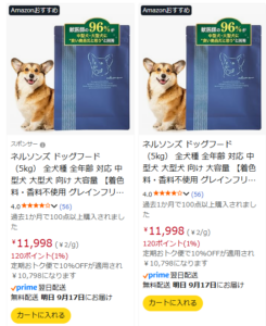 たとえば、「ネルソンズ ドッグフード 5kg 全犬種対応」の商品が確認でき、説明に「着色料・香料不使用・グレインフリー」などの記載があります。
