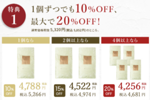 公式サイトでは単品購入よりも定期コースの割引があり、1袋ずつでも10%引き、2〜4袋なら15%引き、5袋以上なら最大20%引きの価格で購入できます。