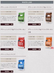 「Green Tripe & Bison」「Green Beef Tripe」「Weight Management SAPラム」など、ラインナップも多様。