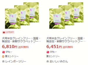 例えばサクラソーケンネル楽天市場店では、サクラペットフードプレミアムのドライフード(カリカリタイプ)800gが3,342円(税込)で販売されています。