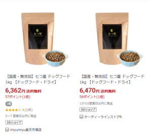 「国産・無添加 七つ星 ドッグフード 1kg」などが出品されており、レビュー数も多く信頼度が高めです。
